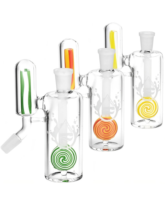 Introducing the "No Ash" Ash Catcher, a delightful addition that'll enhance your smoking experience with candy-inspired sweetness! Designed with a dual chamber system, this accessory not only keeps your bong pristine but also maximizes water filtration. The primary chamber features a vibrant, lollipop-shaped percolator that enriches water filtration—ideal for bongs lacking a built-in perc. Its secondary chamber effectively blocks any ash or splash back from entering your bong, ensuring each rip is smooth and flavorful. The ash catcher comes equipped with a 14mm male connector joint at a 45 or 90-degree angle and is available in a variety of colors.