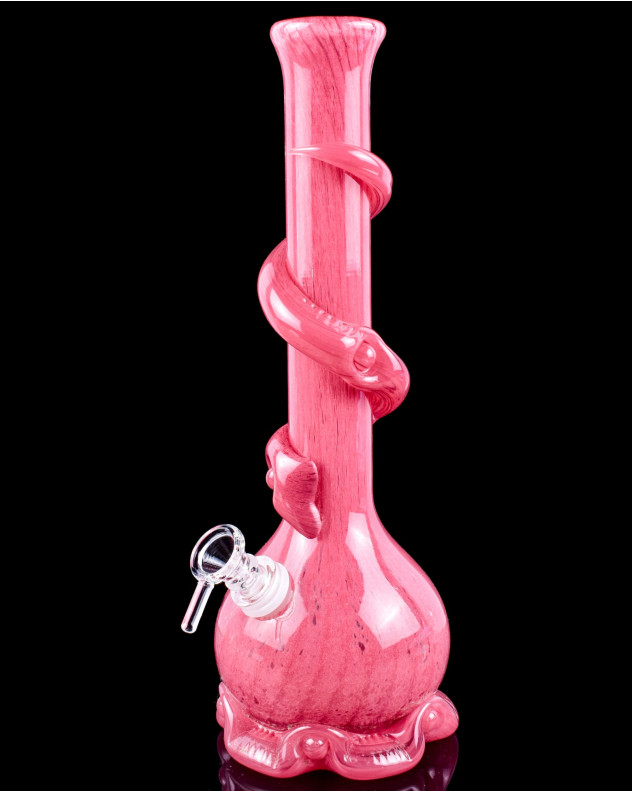 Introducing the Blushing Blossom - 12" Flower Vase Wire Wrapped Round Base Bong, a stunning centerpiece that combines functionality with exquisite artistry. This piece features a vibrant pink hue, reminiscent of blooming flowers, and a unique wire-wrapped design around its round base that adds a touch of elegance and sophistication. Crafted from high-quality glass, the bong stands at 12 inches tall, ensuring a prominent display. The spiral decoration not only enhances its aesthetic appeal but also provides a comfortable grip. The bong comes equipped with a clear glass bowl, perfectly complementing its striking design. Ideal for those who appreciate both style and performance, the Blushing Blossom bong transforms your smoking experience into a visually delightful ritual.