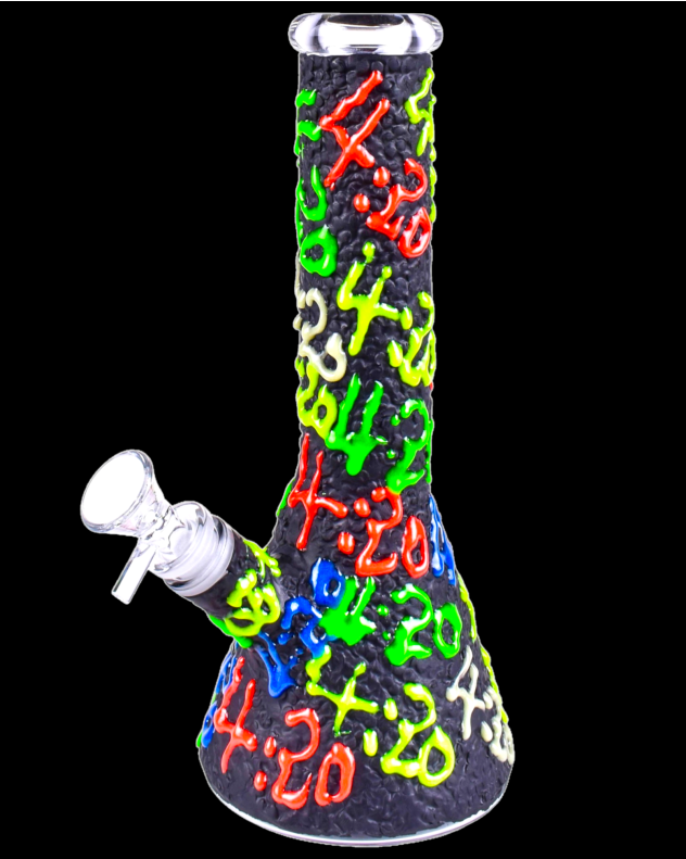 420 After Dark - 3D Painted Glow In The Dark Beaker Bong is built to steal the spotlight once the lights go low. Standing 10 inches tall, this beaker bong features a deep black, heavily textured glass body covered in raised 3D-painted “420” designs that pop with bold neon colors by day and glow brightly in the dark at night. The layered paint gives the piece a gritty, graffiti-style look you can actually feel, making every angle visually loud and unique.