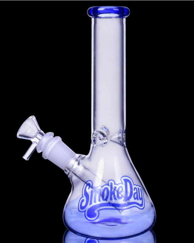 A 14mm glass dry herb bowl and removable 4.5" downstem are included, making this piece ready to use right out of the box. The downstem helps diffuse smoke through water for cleaner, cooler hits, while the beaker shape allows for more water volume compared to straight tubes of the same height. Finished with a bold SmokeDay logo and accented with deep blue glass at the mouthpiece and base, this bong brings both function and style to your collection. Whether at home or on the go, this mini beaker delivers big performance in a compact size.