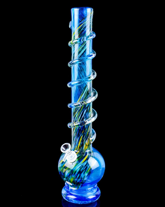 This classic water pipe has the nice round bottom bong look with an added base for stability. This is a great improvement and prevents this extra long 12" pipe from falling over too easily. The glass is gorgeous swirled designed and includes a glass on glass slide. Extra heavy and strong glass.