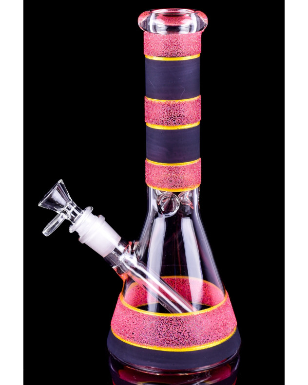The bong measures about 10" in length. Features colored glitter with dual tone color. Glitter patterns are in red shaped all over the beaker. Also, has frosted coloring on neck and the base. Comes with a 14mm bowl and slotted downstem. Made of high quality materials.