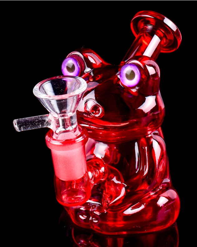 Introducing the "Cute Lil Froggy Mini Bong," an irresistibly charming addition to your collection that combines whimsical design with practicality. Crafted from vibrant green glass, this mini bong stands out with its delightful frog shape, complete with two large, goggly eyes that add a playful touch. Perfectly sized for portability and convenience, it measures just the right height to ensure a smooth smoking experience without the bulk of larger pieces.