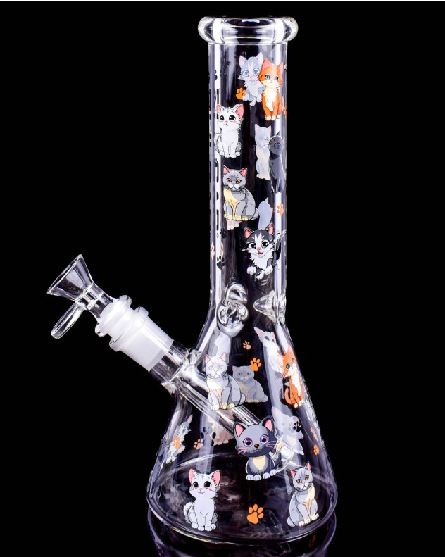 The Kitty Cuddles Beaker Bong is a 10 inch glass piece that brings playful charm to every session. Covered in adorable cartoon kitten decals with tiny paw print accents, this cute beaker bong stands out with a fun, friendly look while still delivering the dependable function smokers love. The classic beaker base offers a stable design and extra room for smooth water filtration, while the straight neck and flared mouthpiece create a comfortable draw.