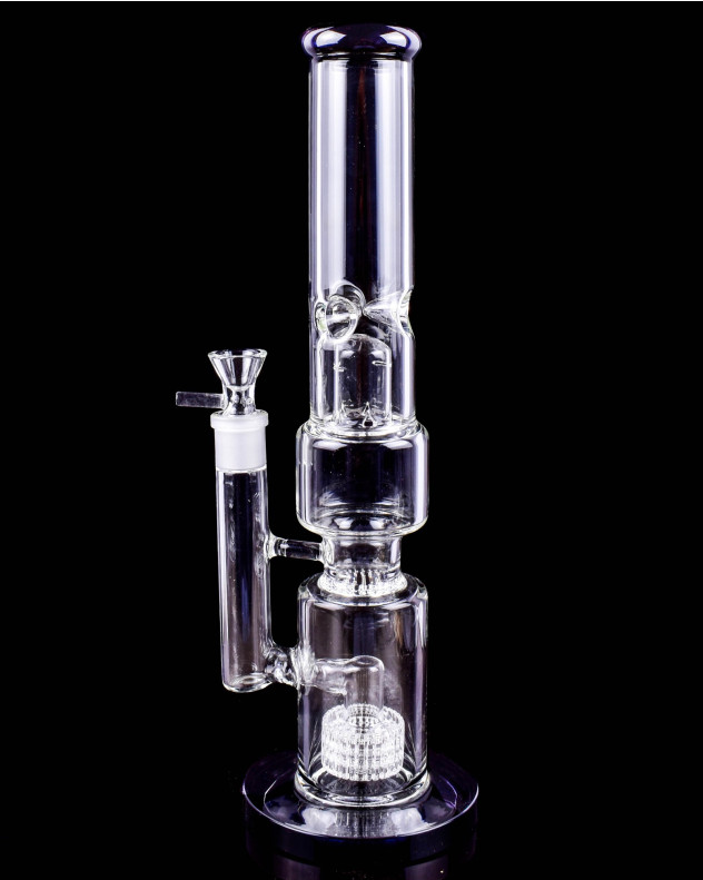 The Midnight Matrix & Bullet Perc Bong delivers a bold mix of height, style, and serious filtration for smokers who want a smoother, cooler pull. Standing 15.5 inches tall, this eye-catching glass bong features a triple perc setup designed to help diffuse smoke through multiple stages before each hit reaches the mouthpiece. The bottom matrix perc works to break up smoke for dense bubbling action, while the upper percs continue filtering for a cleaner and more refined session.