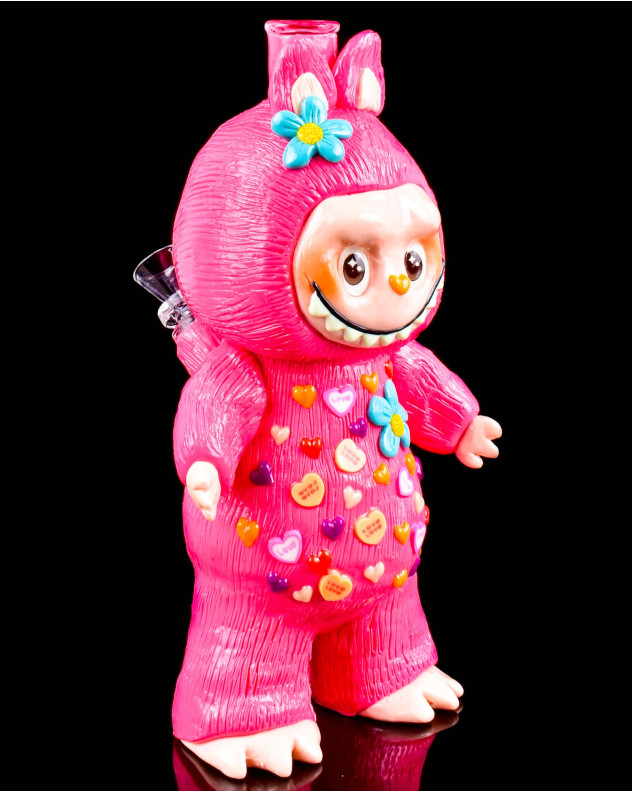 Meet the Lafufu Glow In The Dark Bong, your adorable new smoking sidekick! Standing at 8.5" tall, Lafufu is a bright pink, candy-hearted creature with big sparkling eyes, a cheeky grin, and colorful flowers on its head. Covered in sweet conversation hearts, this playful little monster is full of charm by day-and glows with magical neon energy by night! Crafted with love and detail, Bubalu comes ready with a 10mm bowl for smooth sessions. Equal parts cute collectible and functional piece, this bong will light up your sesh and your shelf. Bring Lafufu home today!