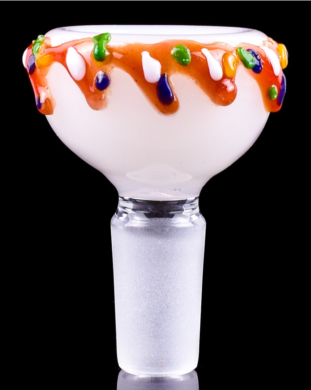 The "Tasty Buds - 14mm Male Ice Cream Cone Bowl" is an eye-catching accessory for any smoker with a flair for fun and colorful designs. This unique bowl features a 14mm male joint, perfect for fitting into any compatible bong or water pipe. The design mimics a delightful ice cream cone, complete with a white, creamy base adorned with colorful, raised glass droplets that resemble tasty sprinkles. These glass accents not only enhance the visual appeal but also provide an improved grip. Crafted from high-quality glass, this bowl ensures durability and a clean smoking experience. It's ideal for those who appreciate a bit of whimsy in their smoking accessories. Whether used for daily smoke sessions or as a centerpiece in a collection, the Ice Cream Cone Bowl brings a playful touch to any setting.