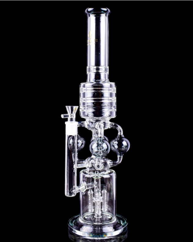 The clear, high-quality borosilicate glass construction allows for a full view of the dynamic percolation action, turning each use into a visual spectacle. The reinforced base ensures stability, while the sleek, straight neck design is accented with subtle branding that speaks to the elegance and sophistication of the piece. Easy to clean and maintain, The Destroyer is not just a bong but a centerpiece, ready to deliver an unparalleled smoking experience.
